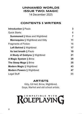 - Issue 2 is about Magic, with Brine’ A Magic System and The Steep Mage, Wightbred’s A Study of Goblyns and Modern Magic, and more.