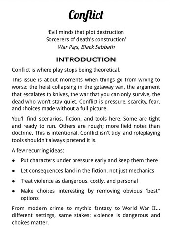 - Issue 3 is about Conflict, with Pete Jones’ Dogs of Hell, Paulo’s Beast of Gevaudan, and Wightbred’s WW2 Blood & Toil.